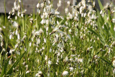 heimisches Gras, anspruchslose Sumpfpflanze für Teichanlagen, für sumpfigen, nährstoffarmen Moosboden, im August erscheinen während der Fruchtreife wieße Wollschöpfe, optisch ein Hingucker