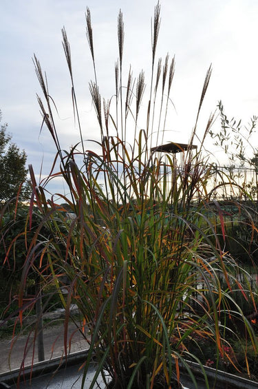 aufrechte Blütenhalme, Blätter breit und bogig wachsend, einmalige Herbstfärbung von braun bis orange und rot, Solitärgras
